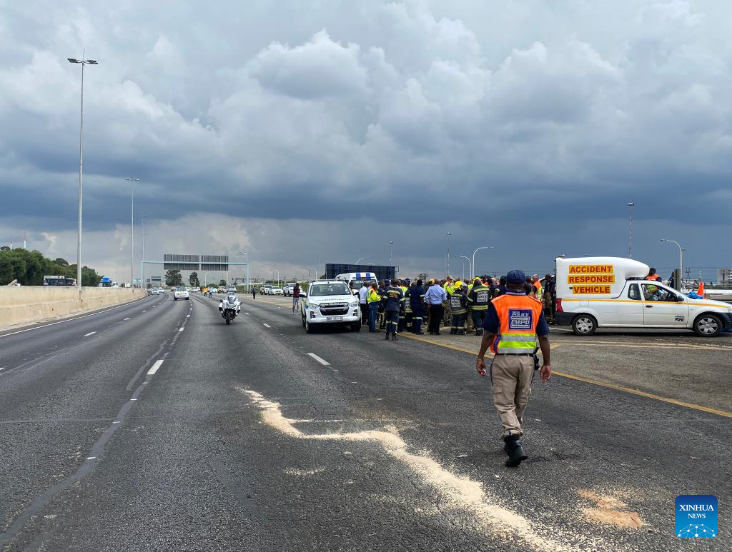 This photo, taken with a mobile phone, shows the site of a bus accident in South Africa’s northeastern Gauteng Province on March 11, 2025. At least 12 people were killed and 45 others injured on Tuesday morning after a bus overturned in South Africa’s northeastern Gauteng Province. (Photo by Shiraaz Mohamed/Xinhua)