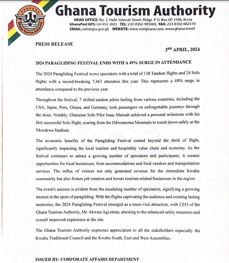 The Ghana Tourism Authority (GTA) has revealed that the 2024 Kwahu Paragliding Festival witnessed a record-breaking attendance of 7,463 people.