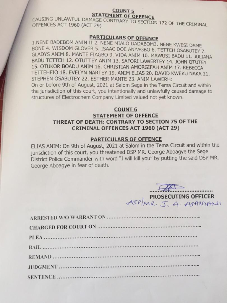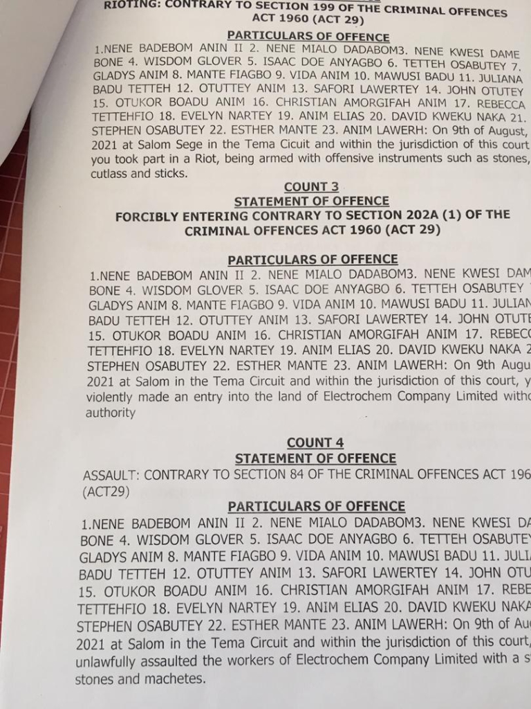 According to court documents available to JoyNews, the initial count is agreeing to act with a common purpose to commit crime; namely rioting at Salom Sege. This is said to be contrary to sections 23(1) and 198 of the Criminal Offences Act 1960 (ACT 29).
