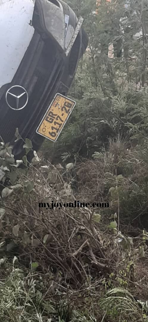 The Sprinter bus with registration number GR 6117-20, according to an eyewitness, fell into a ditch at about 6:30 am this morning after the tyre of the bus burst open around the weighing bridge area.