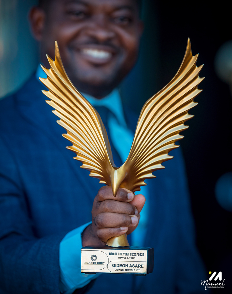 The CEO of Adansi Travels, Gideon Asare, has been awarded the prestigious title of CEO of the Year 2023/2024 in the Travel and Tour category at the 8th Ghana CEO Summit in Accra.