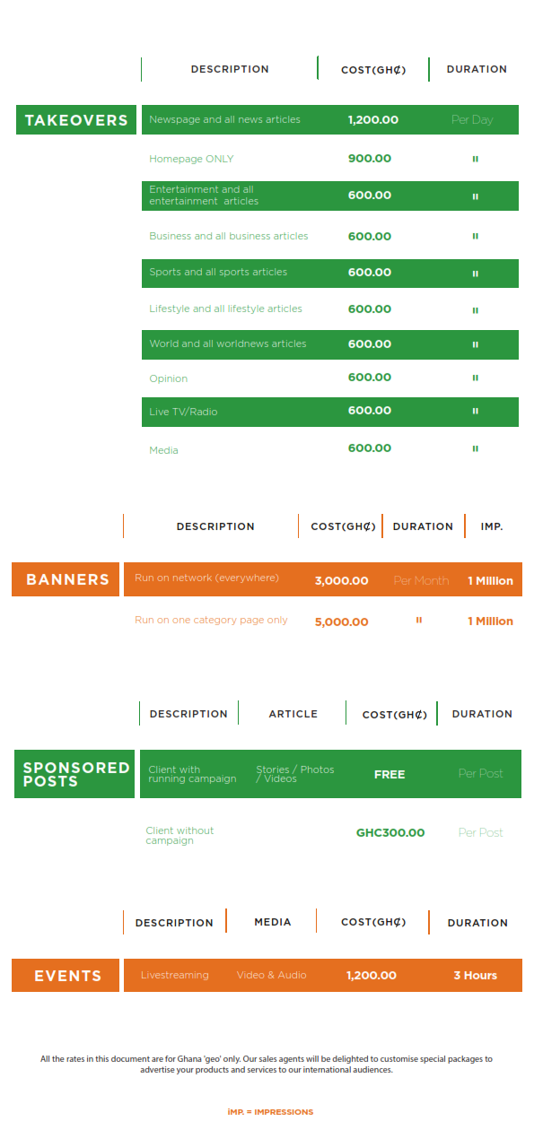 Please, note that the rates in the card are for Ghana only. We can, however, customize special packages for you if you desire to reach audiences in territories outside of Ghana.