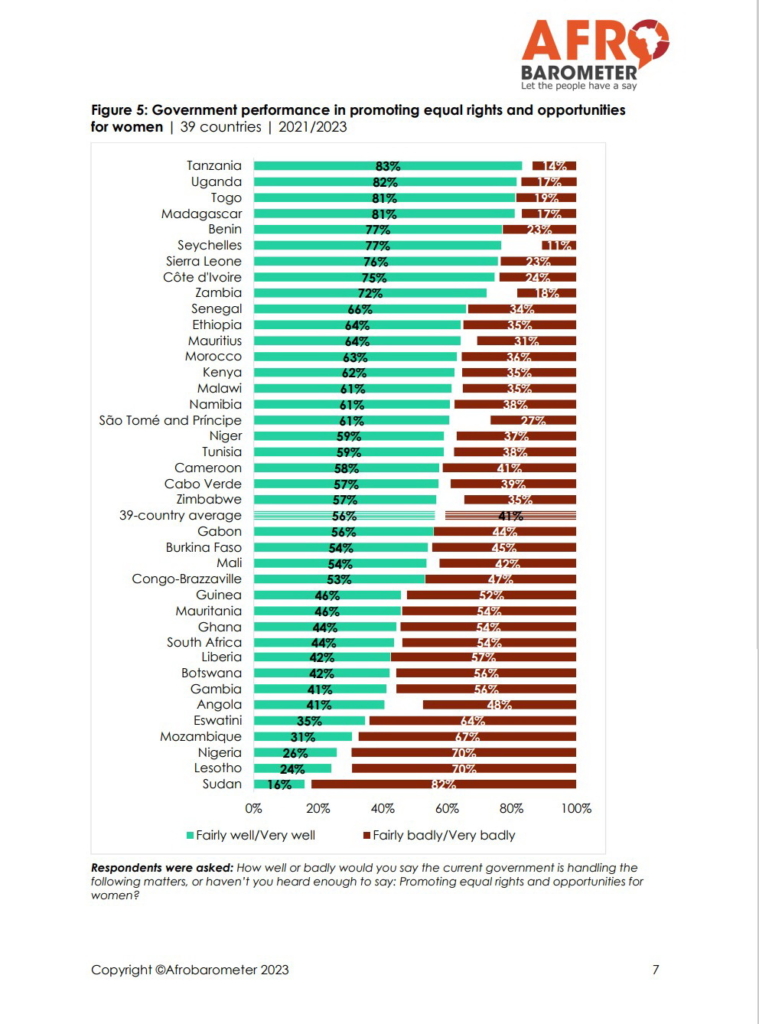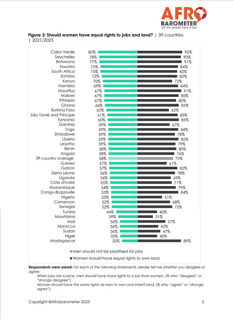 - A narrower majority (58%) endorse women’s equal right to jobs, with support ranging from 32% in Madagascar to 80% in Cabo Verde.