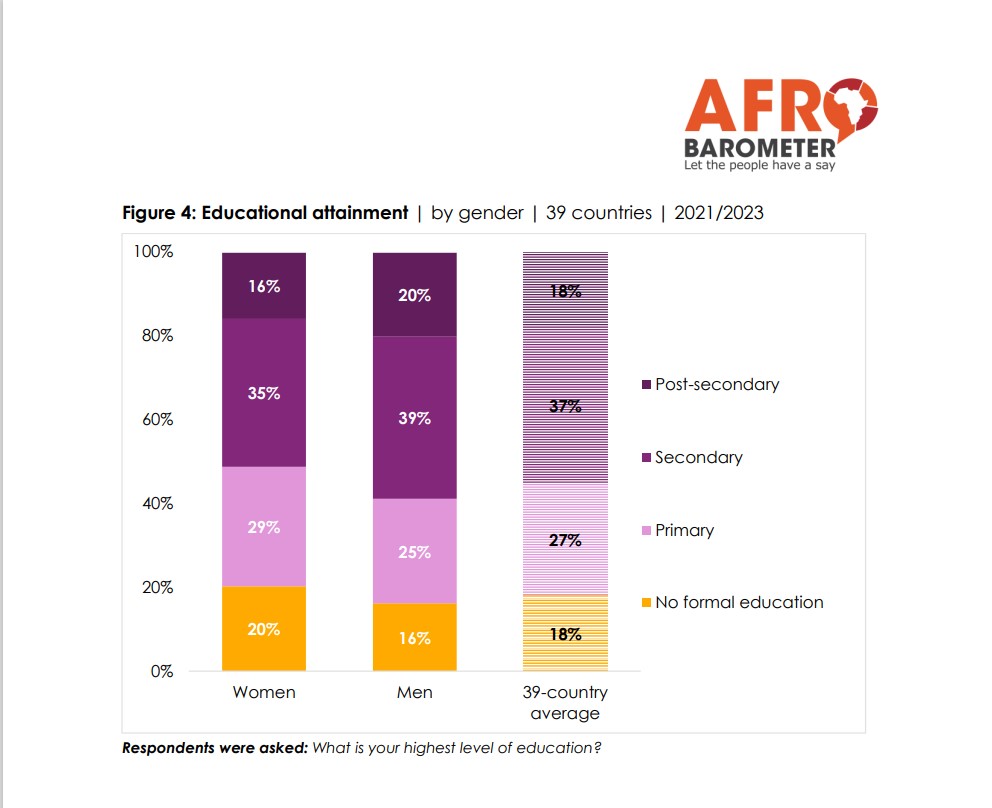 - Among persistent gender gaps documented in survey findings, women are less likely than men to have secondary or post-secondary education (51% vs. 59%) (Figure 4).