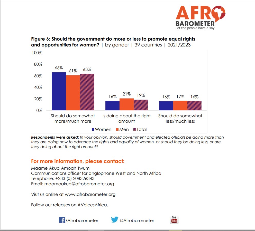 African governments receive relatively positive ratings for their efforts to promote gender equality, but nearly two-thirds of citizens say more needs to be done.