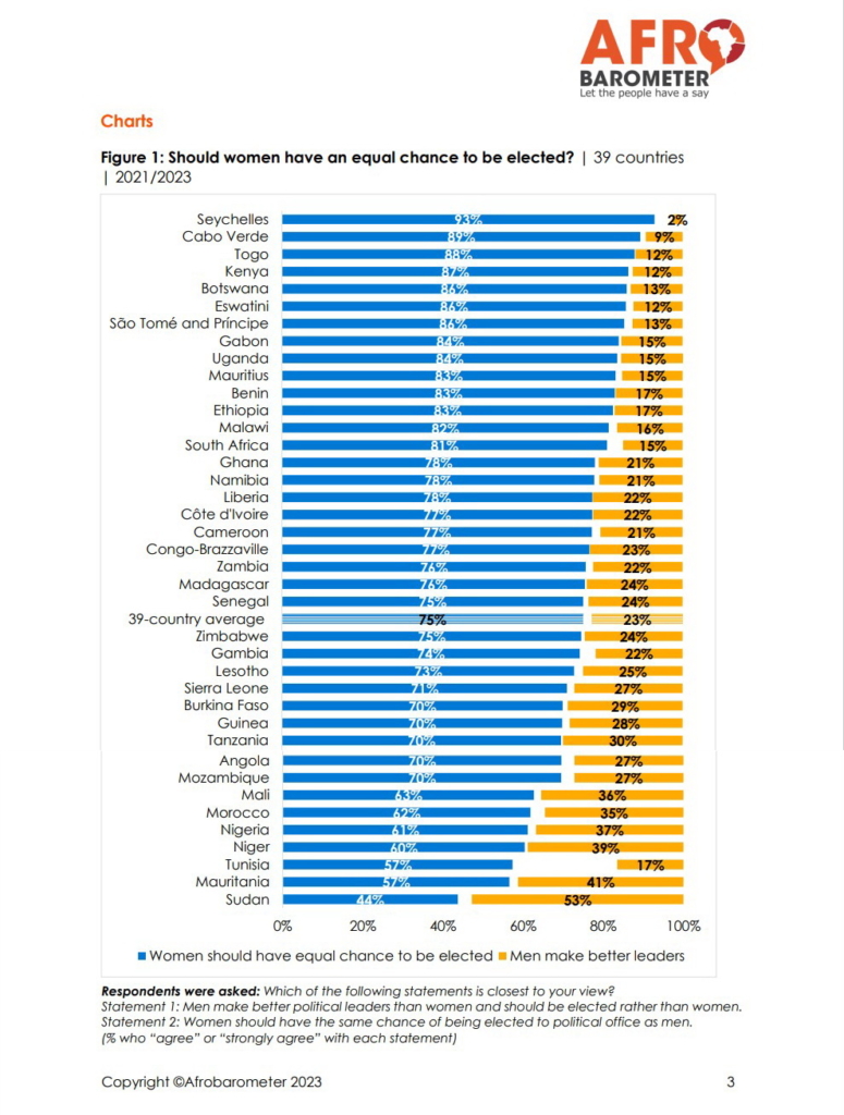 - On average across 39 African countries, a sizeable and (slowly) growing majority (75%) of citizens say women should have the same chance of being elected to public office as men (Figure 1).
