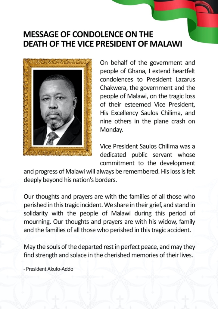 President Akufo-Addo has extended his heartfelt condolences to President Lazarus Chakwera and the people of Malawi on the tragic loss of their Vice President, Saulos Chilima.