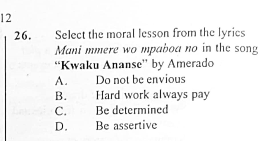 Question 26 of the Section A of the Creative Arts and Design paper, reads: Select the moral lesson from the lyrics Mani mmere wo mpaboa no in the song 'Kwaku Ananse' by Amerado.
