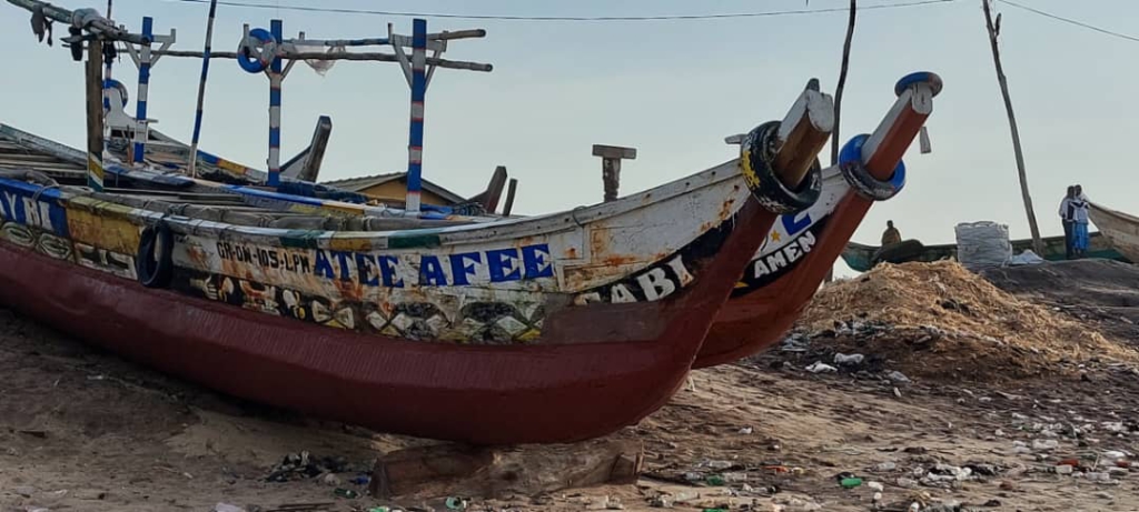 The smell of fish, the sounds from aboard motors and the mild waves from the ocean, paint a cinematic picture of a busy working day at Prampram’s landing beaches. It was a Saturday morning and Abraham, a fisherman, patiently waited for his canoe to dock. Most canoes are anchored offshore until the fishermen are ready for the day’s business before they are brought onshore and prepared for the day’s activity.
