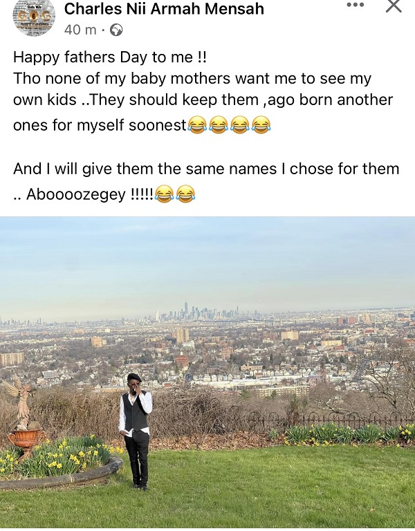 "Happy fathers day to me!! Tho none of my baby mothers want me to see my own kids. They should keep them, ago (I'll) born another one for myself soonest. And I will give them the same names I chose for them," he wrote.