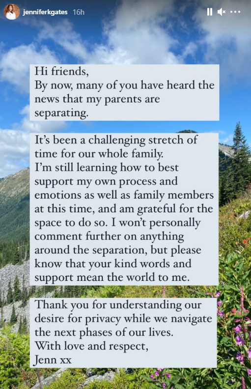 “By now many of you have heard the news that my parents are separating,” she began the post. “It’s been a challenging stretch of time for our whole family.”