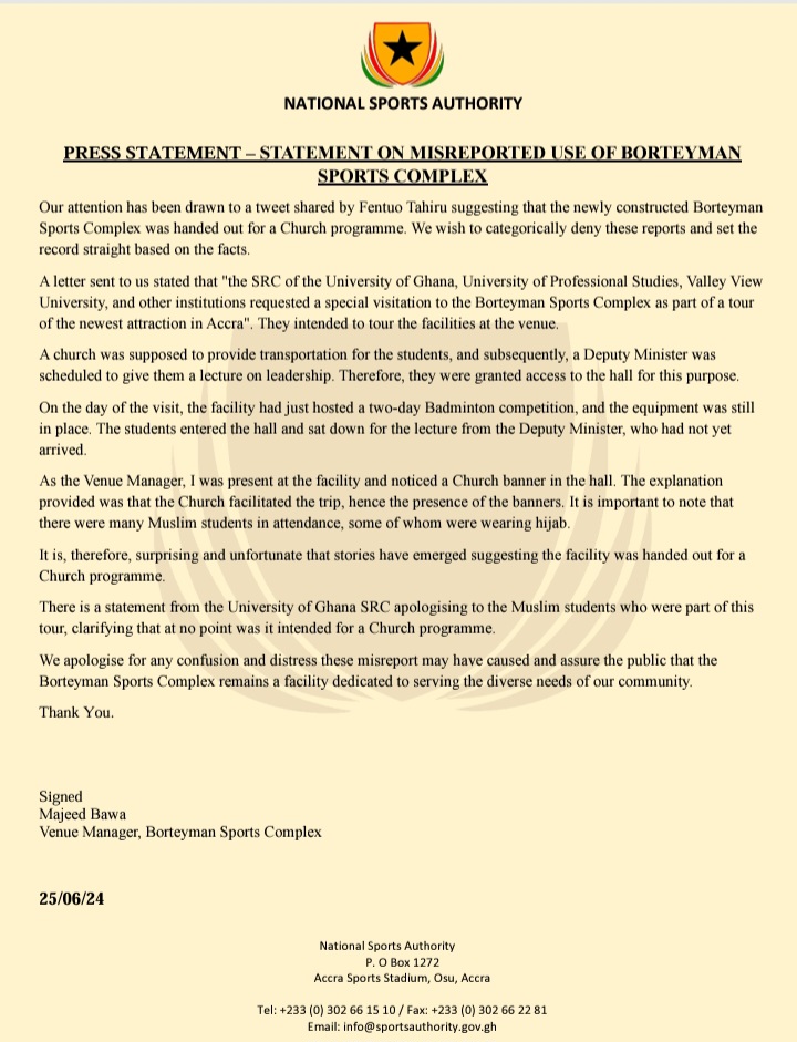 He concluded by apologising for any confusion and distress the misreports may have caused and assured the public that the Borteyman Sports Complex remains a facility dedicated to serving the diverse needs of the community.
