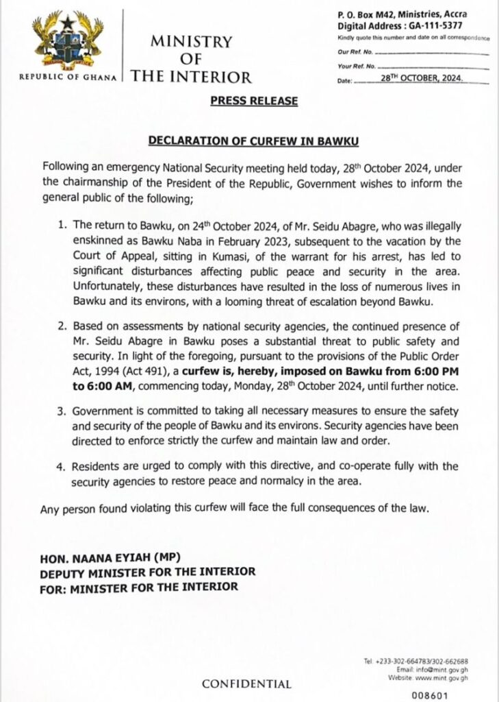 “Based on assessments by national security agencies, the continued presence of Mr. Seidu Abagre in Bawku poses a substantial threat to public safety and security. In light of the foregoing, pursuant to the provisions of the Public Order Act, 1994 (Act 491), a curfew is, hereby, imposed on Bawku from 6:00 PM to 6:00 AM, commencing today, Monday, 28. October 2024, until further notice.”