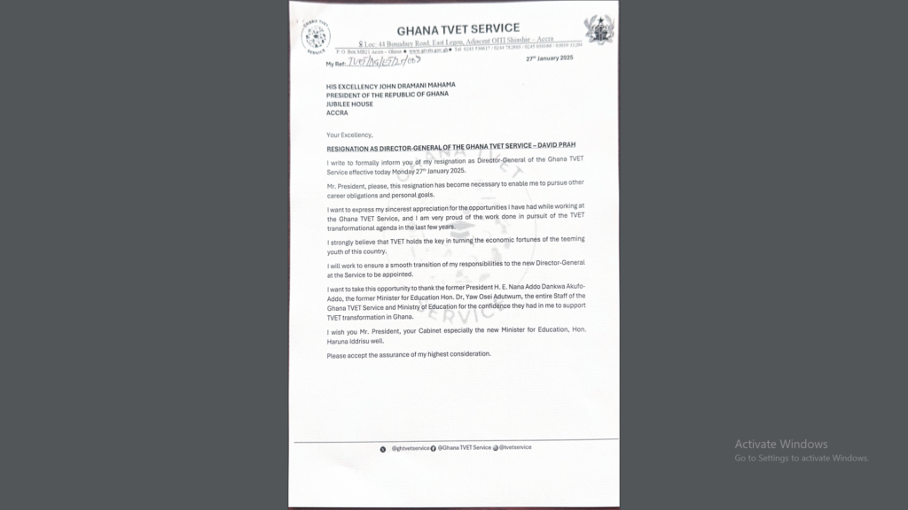 "I write to formally inform you of my resignation as Director-General of the Ghana TVET Service effective today, Monday 27th January 2025. Mr President, please, this resignation has become necessary to enable me to pursue other career obligations and personal goals," portions of the resignation letter noted.