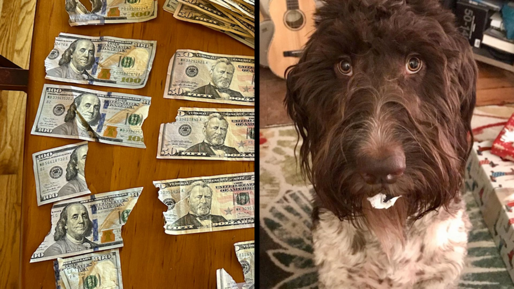 About 30 minutes later, to his surprise, he found his beloved dog enjoying the priciest meal of his life, leaving rough strips and scattered pieces of cash everywhere.