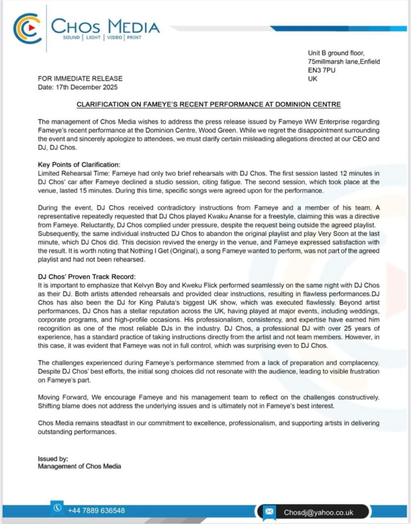 Chos Media, the management of DJ Chos, the disc jockey at the centre of Fameye's outburst during his London show, has responded to claims made by the musician regarding the incident.