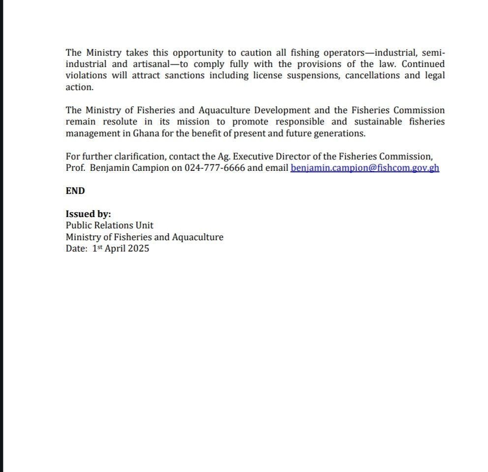 The Ministry cautioned all fishing operators – industrial, semi-industrial, and artisanal –to comply fully with the provisions of the law, adding that continued violations would attract sanctions including license suspensions, cancellations and legal action.