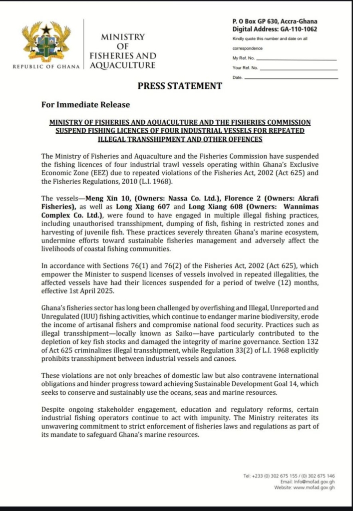 “In accordance with Sections 76(1) and 76(2) of the Fisheries Act, 2002 (Act 625), which empower the minister to suspend licenses of vessels involved in repeated illegalities, the affected vessels have had their licenses suspended for a period of twelve (12) months, effective 1st April 2025,” part of the statement reasd.