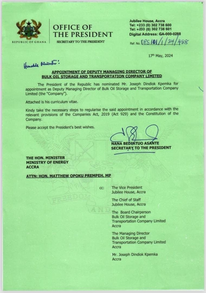 A letter signed by the secretary to the President, Nana Bediatuo Asante has asked the Energy Minster, Dr Mathhew Opoku Prempeh to take the necessary steps to regularise his appointment.