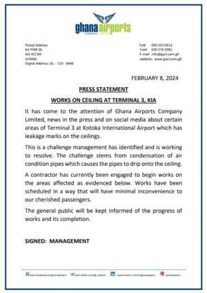 The Ghana Airports Company Limited (GACL) has commenced repair works on the ceilings at Terminal 3 of the Kotoka International Airport (KIA).