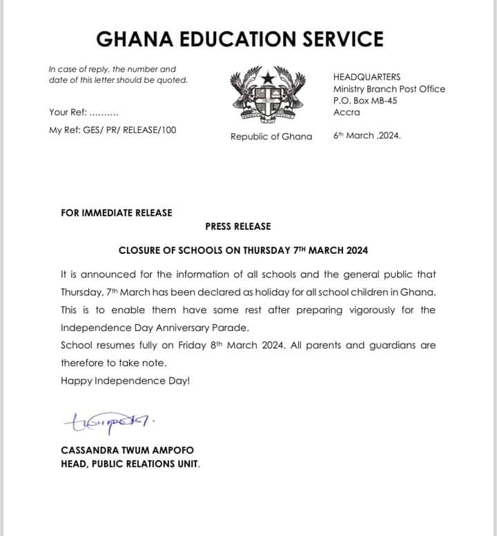 “It is announced for the information of all schools and the general public that Thursday, 7th March has been declared a holiday for all school children in Ghana. School resumes fully on Friday 8, March 2024. All parents and guardians are therefore to take note," an excerpt of the statement said.