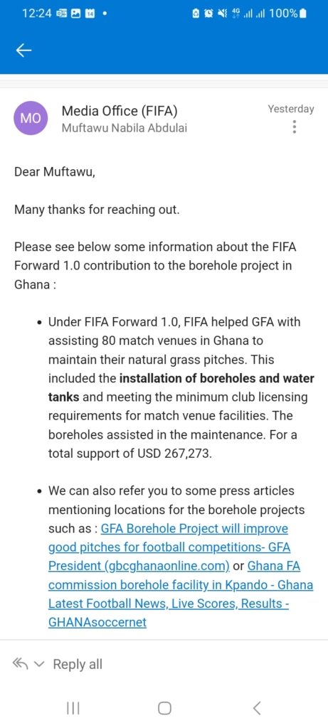 In response, FIFA stated: "FIFA helped GFA with assisting 80 match venues in Ghana to maintain their natural grass pitches. This included the installation of boreholes and water tanks and meeting the minimum club licensing requirements for match venue facilities. The boreholes assisted in the maintenance. For a total support of USD 267,273."
