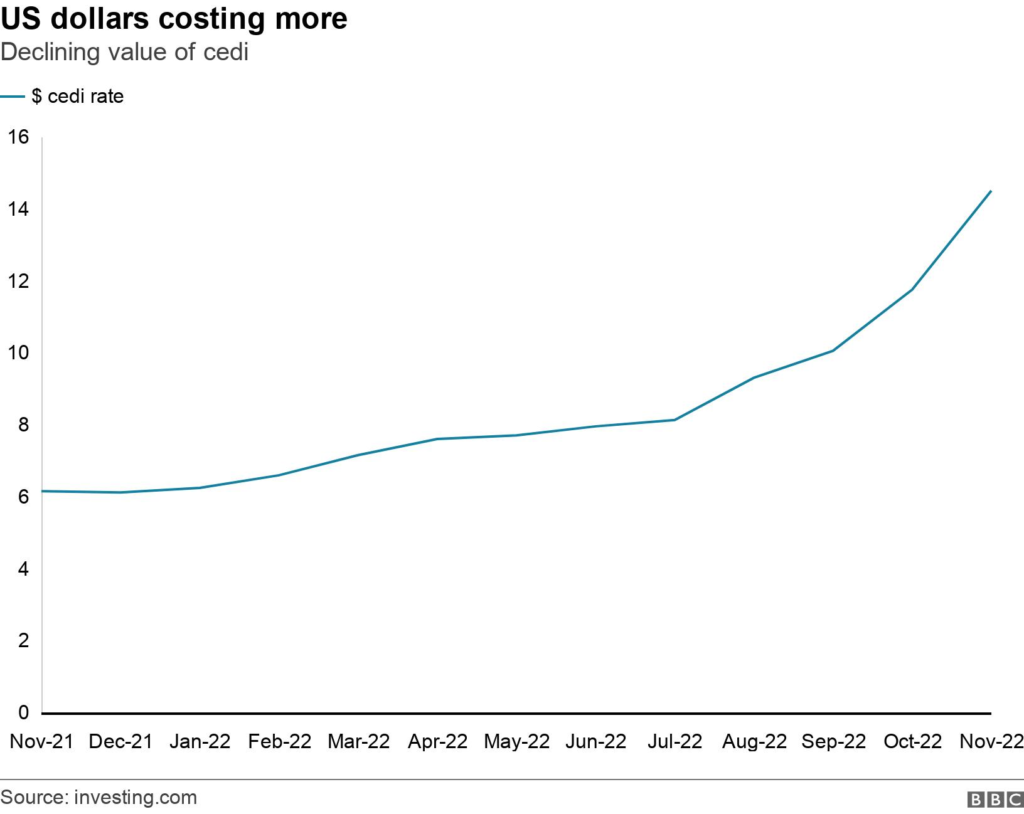 This is partly due to the strength of the dollar caused by increases in US interest rates, but the cedi has performed particularly badly, losing more than half its value this year, as the government has been unable to borrow more dollars to shore up reserves and some investors have pulled out.