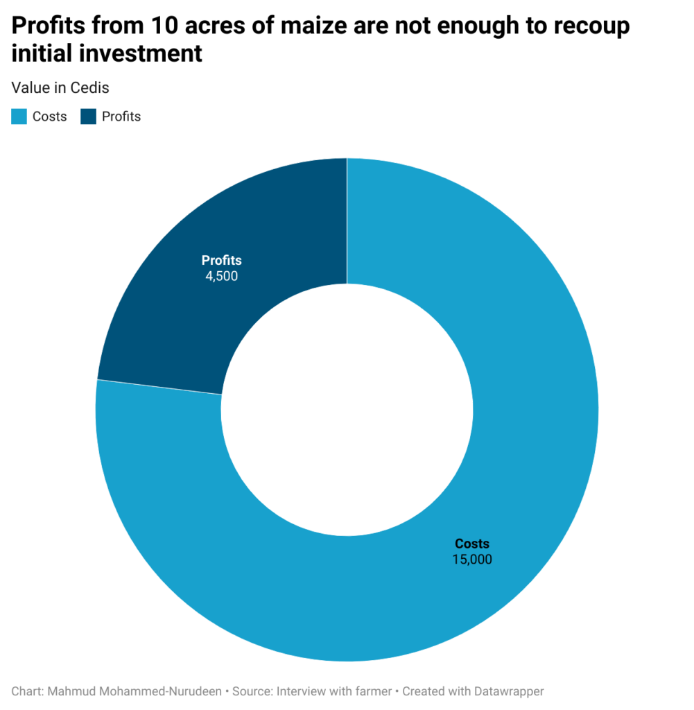 After one of these seasons of only growing maize, he had revenue of about 2000 cedis but spent at least 1500 cedis on inputs for one acre of land. As a result, his profit of roughly 4,500 cedis from 10 acres of farmland was not enough to recoup his initial investment plus the cost of inputs.