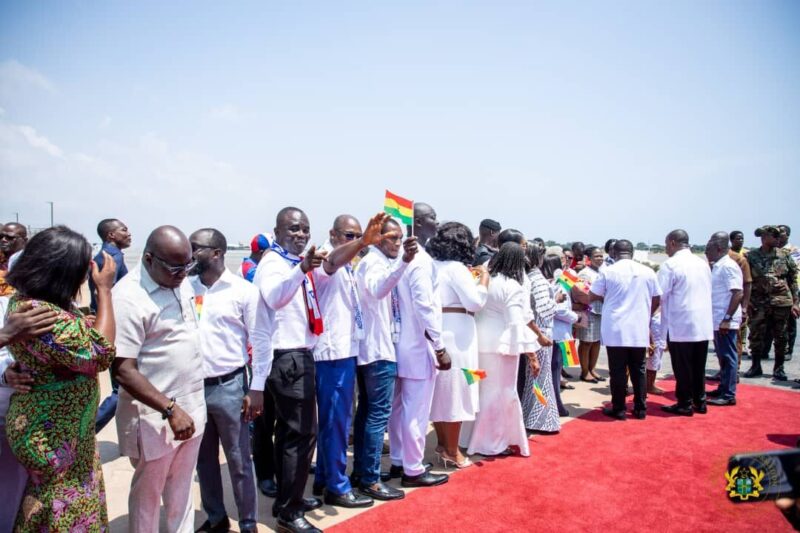 The welcoming ceremony for the two dignitaries was spectacular, with an enthusiastic cross-section of the public who had gathered at the Airport, waving miniature Ghana flags in solidarity as the two personalities disembarked from the Emirates Airline on which they were aboard.
