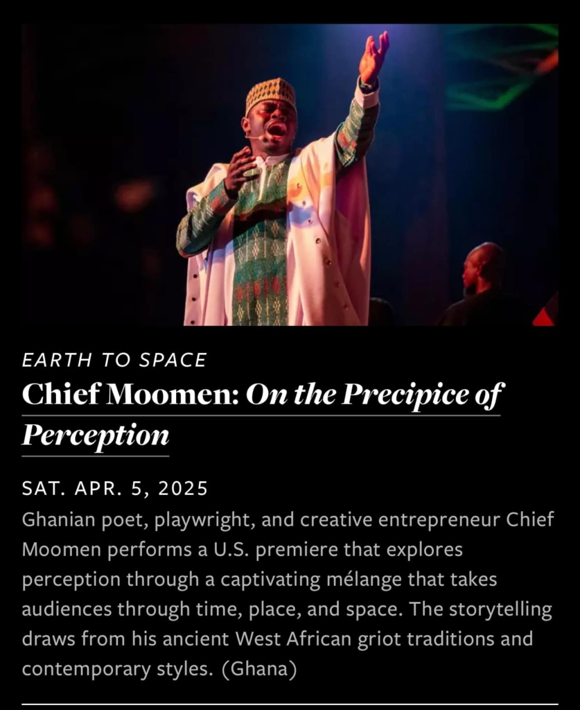 Ghanaian poet and playwright Chief Moomen will be performing at Earth to Space Festival slated for April 2025 at The Kennedy Center in Washington DC.
