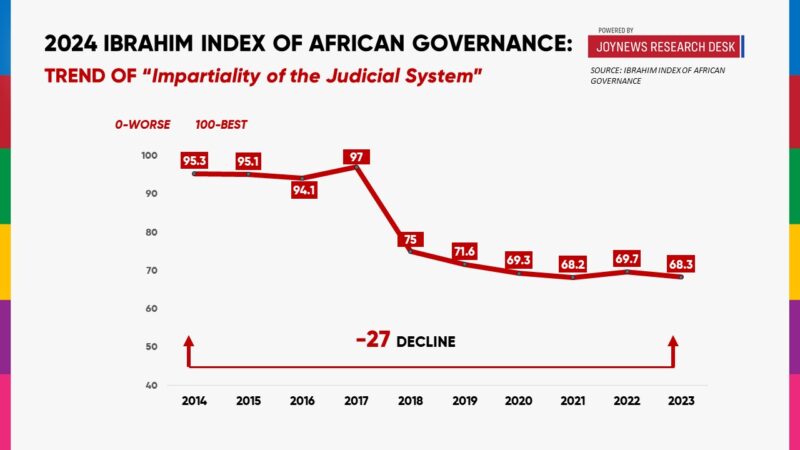 Ghana’s rule of law and justice, a system that ensures that laws are applied equally and fairly to all individuals, protecting rights and preventing abuse of power, has seen the worst decline among 54 African countries over the last decade.