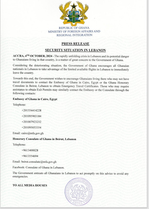 In a press release dated Friday, October 4, the Ministry noted the limited availability of flights out of Lebanon and urged Ghanaians to seize these opportunities to evacuate.