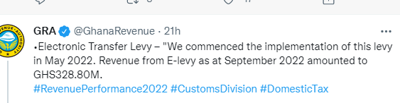 “We commenced the implementation of this levy in May 2022. Revenue from E-levy as at September 2022 amounted to ¢328.80m”, it said in a tweet.