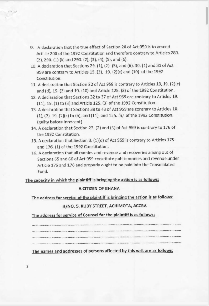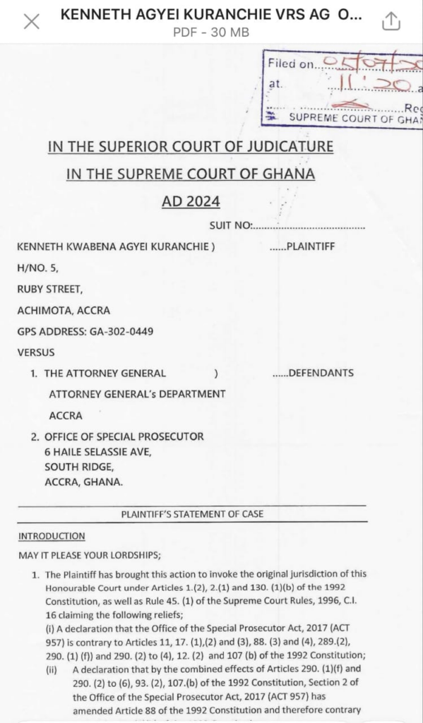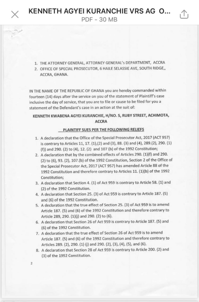 Mr Kuranchie in his writ is asking the Supreme Court to declare the Special Prosecutor Act, 2017 (ACT 957) as contrary to “Articles 11, 17. (1)(2) and (3), 88. (3) and (4), 289.(2) 290. (1) (f)) and 290. (2) to (4), 12. (2) and 107 (b) of the 1992 Constitution.”