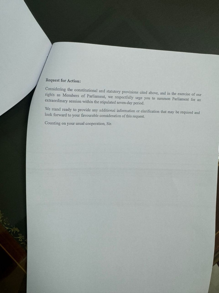 "Considering the constitutional and statutory provision cited above, and in the exercise of our rights as Members of Parliament, we respectfully urge you to summon Parliament for an extraordinary session within the stipulated seven-day period.”