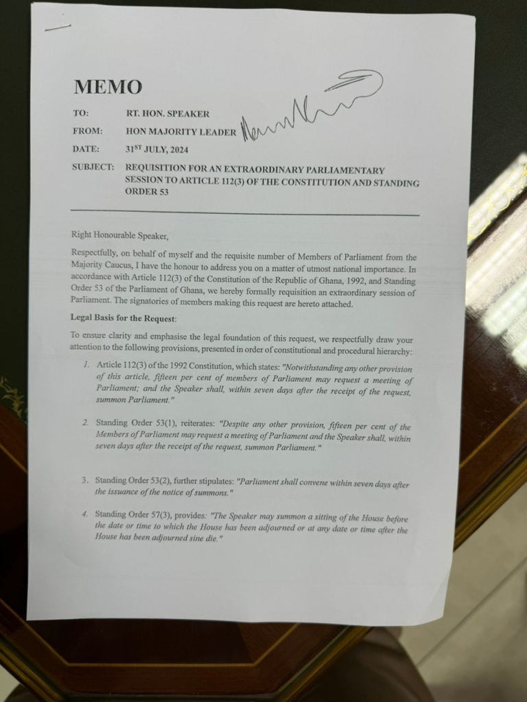 The Majority Leader, Alexander Afenyo-Markin, has requested an extraordinary sitting of Parliament barely 24 hours after the House was adjourned.