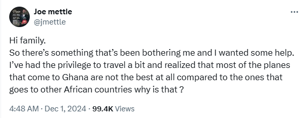 He wrote in a post on X: "Hi family. So there’s something that’s been bothering me and I wanted some help. I’ve had the privilege to travel a bit and realized that most of the planes that come to Ghana are not the best at all compared to the ones that go to other African countries why is that?".