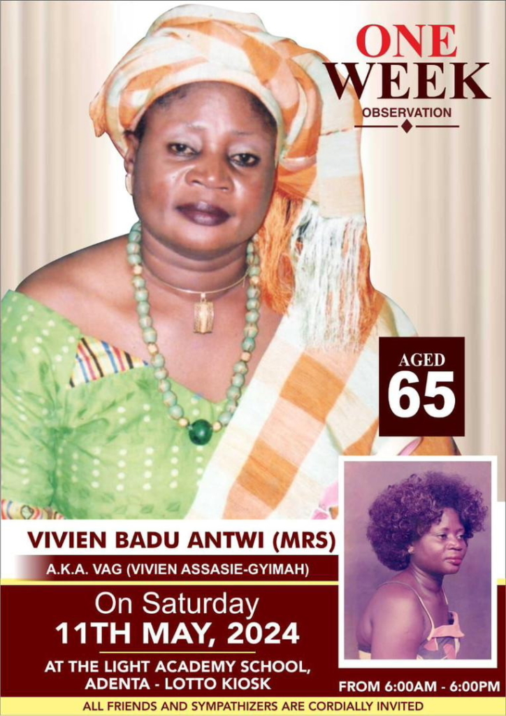 The entire family wishes to invite well wishers and sympathizers to the one week observation of their beloved: