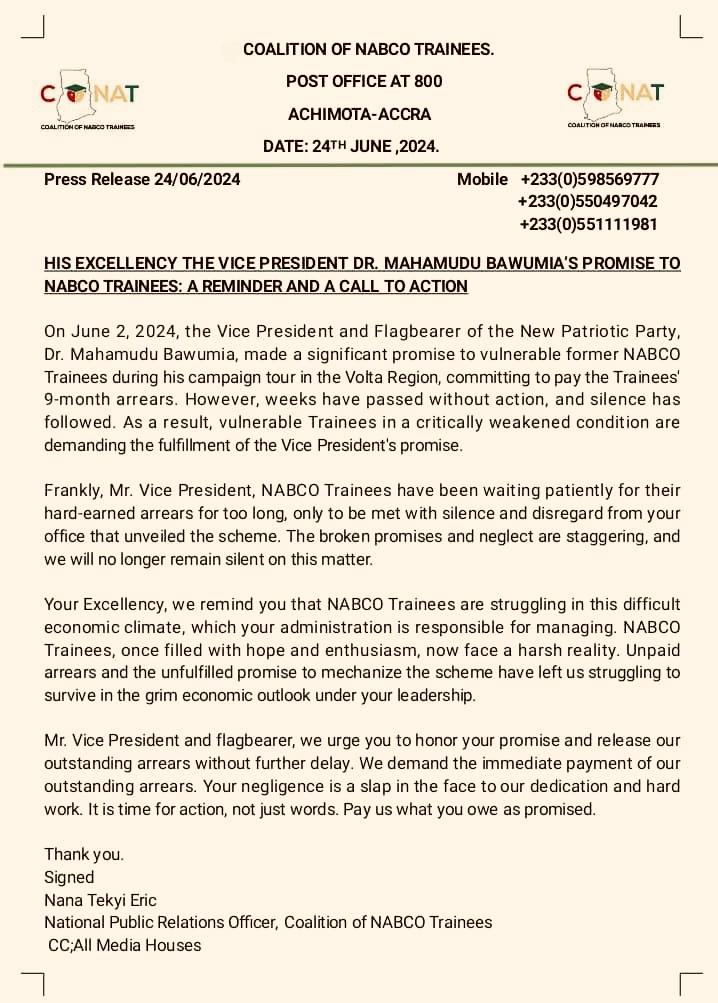 “On June 2, 2024, the Vice President and Flagbearer of the New Patriotic Party, Dr Mahamudu Bawurnia, made a significant promise to vulnerable former NABCO Trainees during his campaign tour in the Volta Region, committing to pay the Trainees’ 9-month arrears."