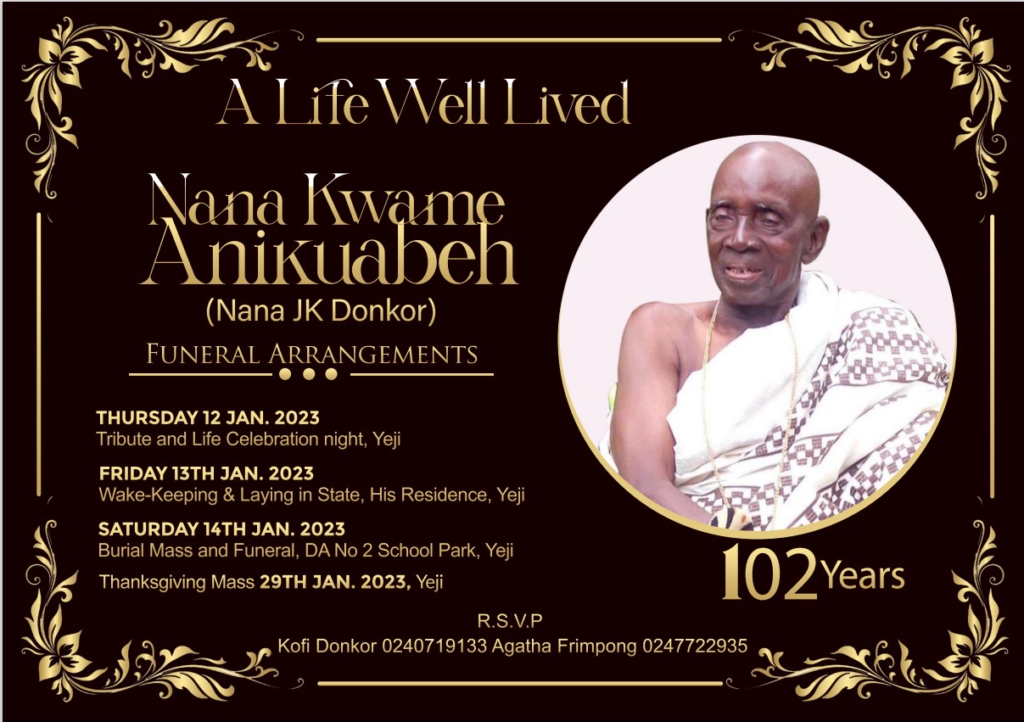 Nana Pemapim Yaw Kagbrese V (Paramount Chief of Yeji Traditional Area and President of Bono East House of Chiefs), Nana Mprah Besemuna III (Omanhene of Krachi Traditional Area and President of Oti Regional House of Chiefs) Nana Wuram II (Lontohene), Nana Okogyeakrabo Kwame Dennyeh (Katakpenjihene), Most Rev Dominic Yeboah Nyarko (Catholic Bishop of Techiman Diocese) Obrese JK Yentumi (Yeji), Obrese TK Bruku (Yeji), Rev EK Osei (Yeji), Obrese SK Kusil (Yeji), Obrese Kwame Addo (Accra), Msgr. John Boakye Gyan, Rev Fr Anthony Asamoah, Ambassador Bebaako Mensah (Accra) announce the death of Nana Kwame Anikuabeh, (Nana J.K. Donkor). Aged: 102 Years.