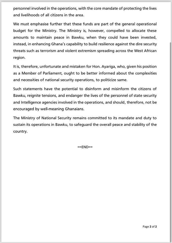 The Ministry of National Security has criticised the Member of Parliament for Bawku Central, Mahama Ayariga, for his recent comments on the budget allocation to address the conflict in Bawku, and his doubts that it is being applied as desired.
