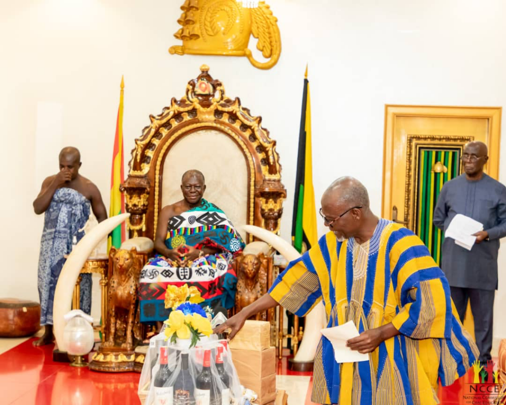 The visit was to congratulate the Otumfuo on his Silver Jubilee Anniversary, inform him about NCCE's presence in his Kingdom to launch the Commission’s 2024 Annual Constitution Week Celebration, seek wise counsel and hold a discussion on how to revive the Commission’s long-standing relationship with Manhyia.Â