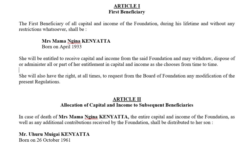 Documents show that a foundation called Varies was set up in 2003 in Panama, naming Mr Kenyatta's mother, Ngina, 88, as the first benefactor - and Kenya's leader as the second benefactor, who would inherit it after her death.