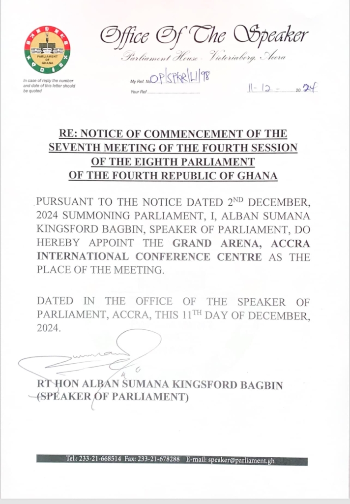 Speaker Alban Sumana Kingsford Bagbin has summoned Parliament to convene at the Grand Arena on Monday, 16th December.