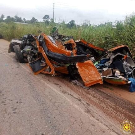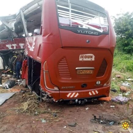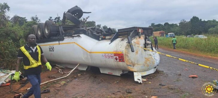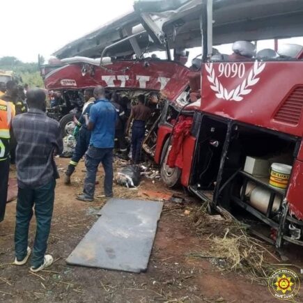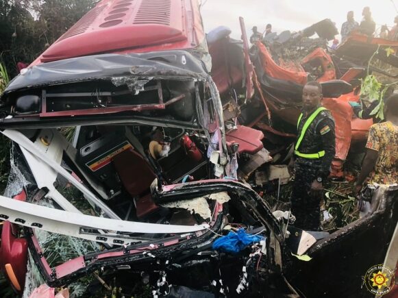According to a statement from the Ghana National Fire Service (GNFS), the fatal collision took place at 4:38 a.m. when the fuel tanker, registered GE-9644-21, suffered a tyre burst, causing it to swerve into the opposite lane and collide head-on with a VIP bus, registered GR-7632-24. The crash resulted in both vehicles overturning, trapping passengers inside.