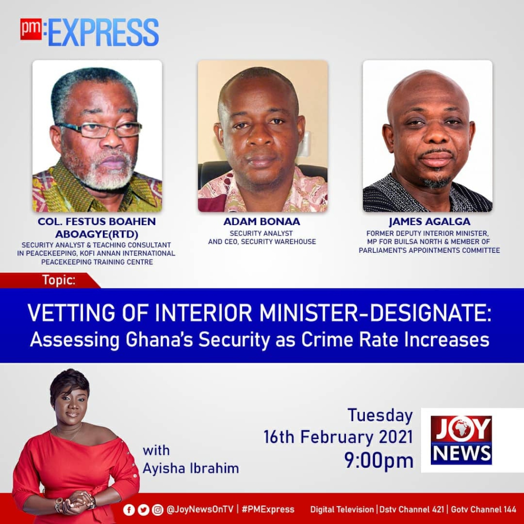 On PM: Express tonight Ayisha Ibrahim together with her panel discuss the vetting of Interior Minister-Designate as they assess Ghana's security following the increase in crime in the country.