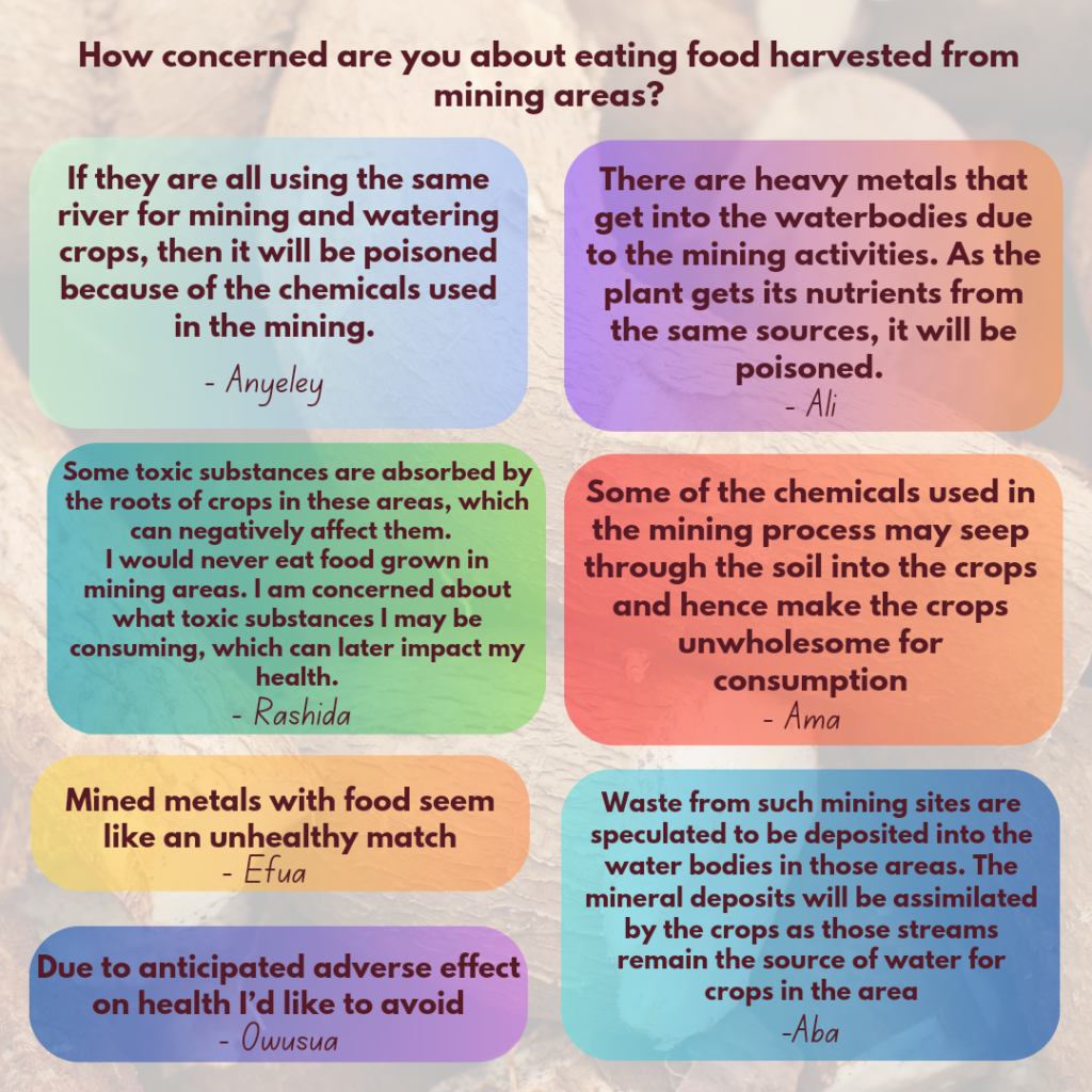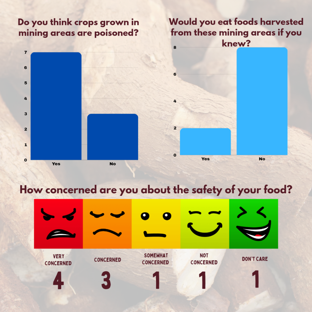 Nonetheless, since most people I interviewed were concerned with eating foods coming from mining sites, and the risk of long-term negative effects suggest the need to formulate policies to guide the planting, harvesting and consumption of food crops from mining areas to safeguard the health of the population.
