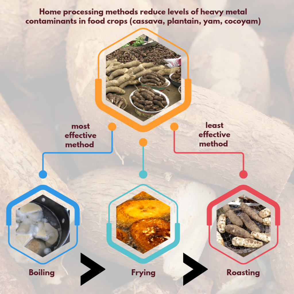 With the presence of these heavy metal contaminants in popular food staples in Ghana, Dr. Hayford Ofori and friends from the Food Research Institute of the Council for Scientific and Industrial Research in 2021 wanted to investigate the effectiveness of home processing methods such as boiling, frying and roasting in significantly reducing the levels of heavy metal contaminants in food crops grown in and around two main mining centers in Ghana. The crops are cassava, plantain, yam and cocoyam.