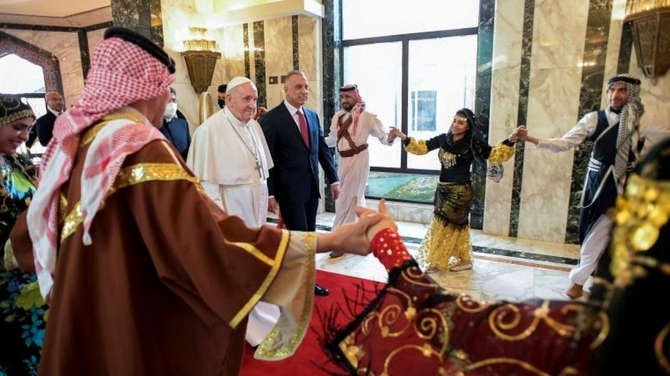 Iraq's PM Mustafa al-Kadhimi greeted him at the airport, with a red carpet, Iraqis in national dress and songs from a largely unmasked choir.
