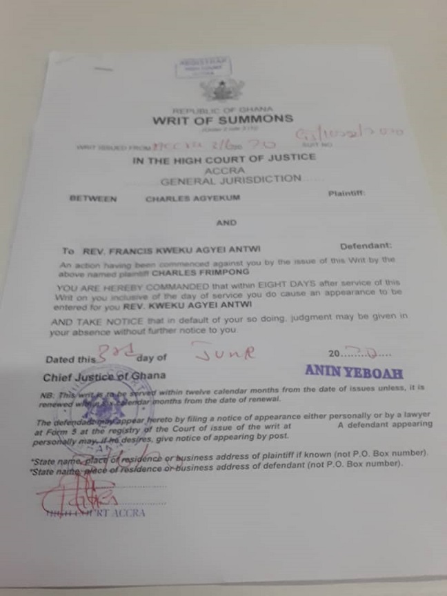 The writ of summon which was issued on June 3, 2020 states that Reverend Obofour has eight days to cause an appearance or have judgement passed in his absence.